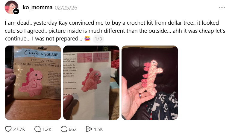 Sometimes you find things that just make you laugh at the moment you most need it, like Jennifer Beaver’s cursed Dollar Tree crochet projects (one more lesson, a la Maggie McGaugh, that AI is everywhere, including in advertising and packaging for home decor and crafts items), the sometimes wacky names of English villages, workplace stalkers (almost always cats, but occasionally dogs), Richard’s wife popping up again to tell the porn-bots commenting on his account that he died, any number of people who, like me, are currently dealing with cats that aren’t ours but think they should be (Mooch, you rascal) … or Kathy Griffin.