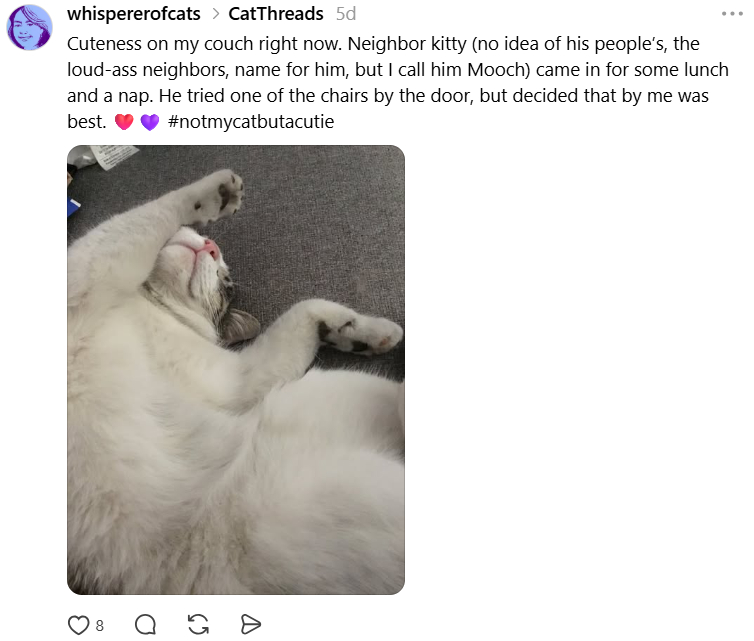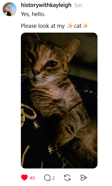 If you’re like me, more a social-media consumer than creator, that’s just fine, and results in a feed full of goofy humor, cat-tax evaders (if you mention a cat in a post, you must post a picture of said cat as cat tax, and it’s vigorously enforced by users), people celebrating sobriety or seeking moral support, word-nerdiness and just all-around fun.