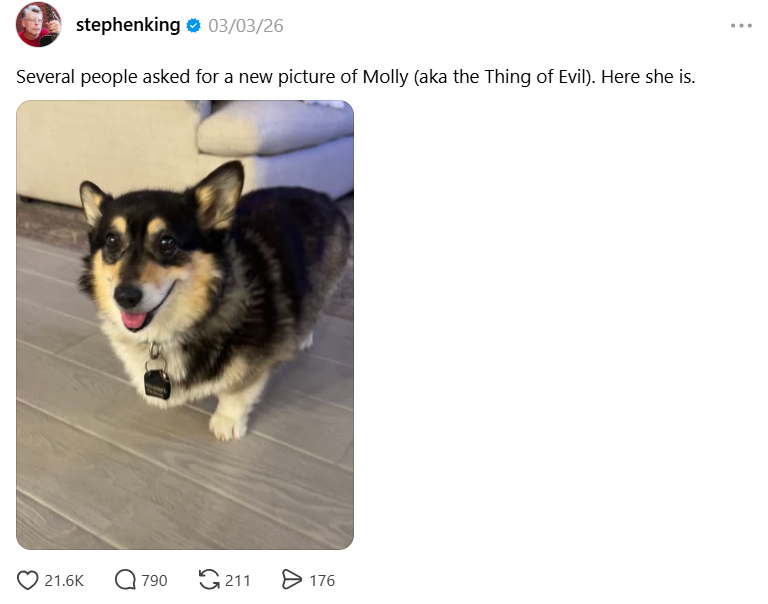 Cat people. Dog people. Photographers (oh, so many great ones to follow!). Mutual aid. LGBTQ+, mental health, cancer and sobriety support. Stephen King and Molly, The Thing of Evil (an absolutely adorable pooch belonging to the author). People persevering despite setbacks. Library joy.