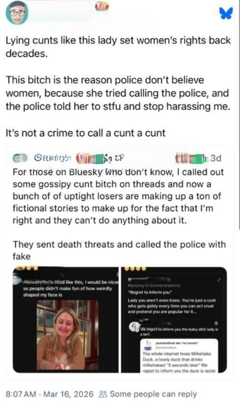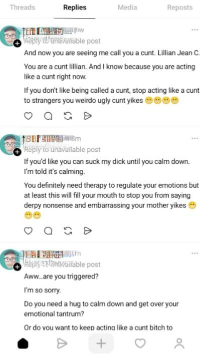 After many, many reports made to Threads and the police where he lives, his account was finally deactivated (though he claims it’s still active). However, he has continued posting on Instagram as well as BlueSky, claiming he was the one getting death threats (dude, you posted your own address and said yourself that no one showed up to challenge you, so … doubtful). He also has continued his harassment of the woman, just not on Threads anymore.