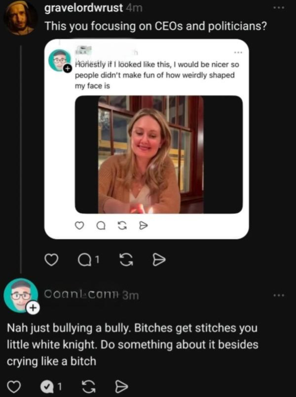 This is not bullying a bully. It’s harassment, pure and simple, just because he didn’t agree with something she said online. If he had let it go, that would be one thing, but he continues his harassment on other platforms. Ignoring things like this is how women get killed. Screenshot from Threads. Click to embiggen.
