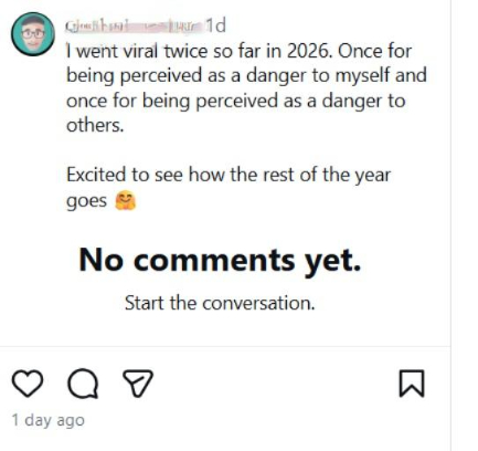 More to the point, he posted that he’s gone viral twice this year so far, once because of supposed suicidal ideation (I’m not convinced in extensive reading of his posts), and the second because people decided he was a danger to others (claiming you can kill with impunity will do that).