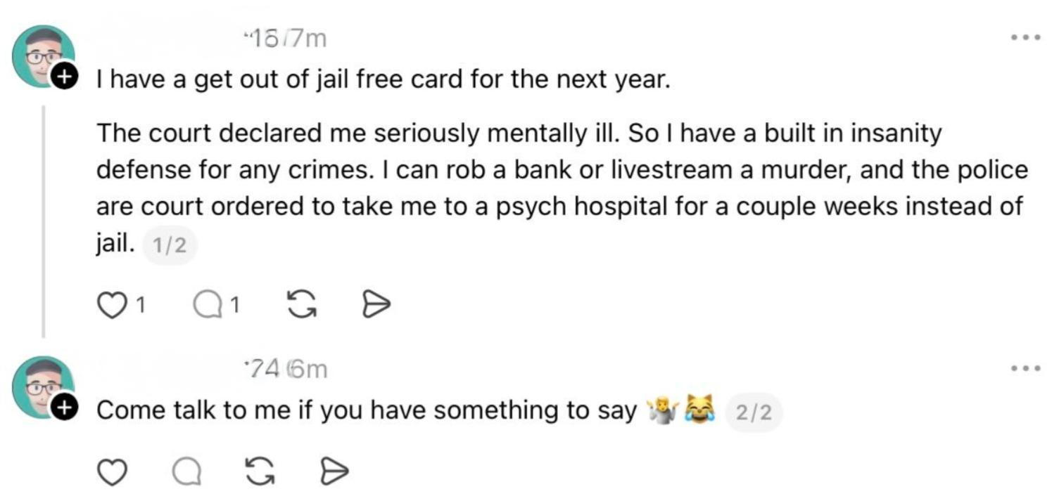 I think those who witnessed the outrageous behavior on Threads last week—such as the troll’s claim that he couldn’t be held responsible by police for anything up to and including murder because he’d been determined to be insane—would agree.