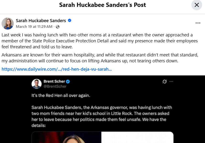 🤬 Be wary of coverage from blatantly partisan outlets. The Daily Wire (run by conservative pundit Ben Shapiro) was one of the first outlets to pick up the Sanders story (non-story, more like, but in a 24/7/365 environment, well …), and the governor’s social media post included the story, which had the lede, “It’s the Red Hen all over again,” alluding to the 2018 incident where she was asked to leave that restaurant. Ignore that the situations aren’t the same (and to those crowing that the Red Hen went out of business, not quite; the owners closed that restaurant in 2023 and launched a new successful restaurant in the same location in 2024); the governor and her party finished their lunch, had paid, and were chatting at two tables during lunch rush in a small restaurant that depends on being able to flip tables for new customers, and that in fact posts a 90-minute limit at each table. It didn’t help that one employee posted a message to her days later on social media, which some are using as proof that it was political (they’re also twisting what the owners said in their statement after the story became public, likely because of, I believe, a member of the governor’s staff tipping off Shapiro’s site, which was what the owners were responding to, such as the claim that people felt “threatened”).