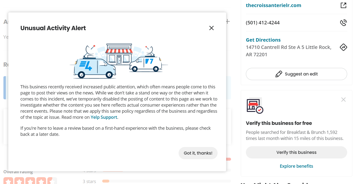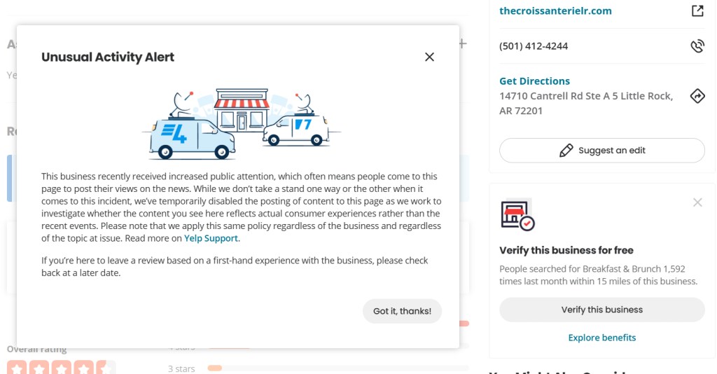 Social media blew up the whole Croissanterie thing into something political when it wasn’t really (and encouraged people who’ve never been to the restaurant or even live anywhere near here to leave scathing reviews; at least eat something there before you review, and please don’t bogart tables during the lunch rush). Comments on Facebook posts by the restaurant (not about the incident) and anyone reporting on it were crazed, with most of the commenters appearing to have never been there, basing their comments on hyperpartisan “news” online.