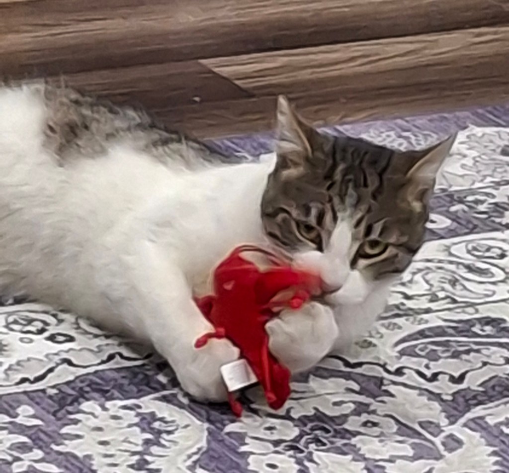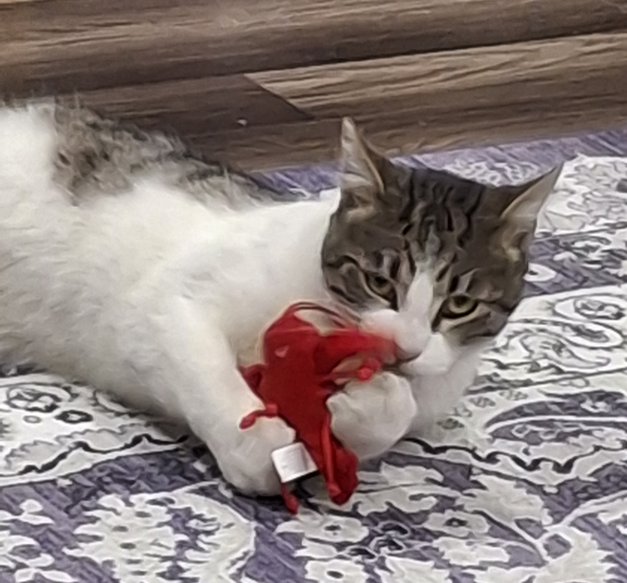 Here’s something to smile about. I got Mooch lobster and shrimp toys after my eye appointment Monday. You never know how a stray/semi-feral cat that lives mostly outside will react to toys, but he loves them, and spent quite a while attacking them and entertaining me.