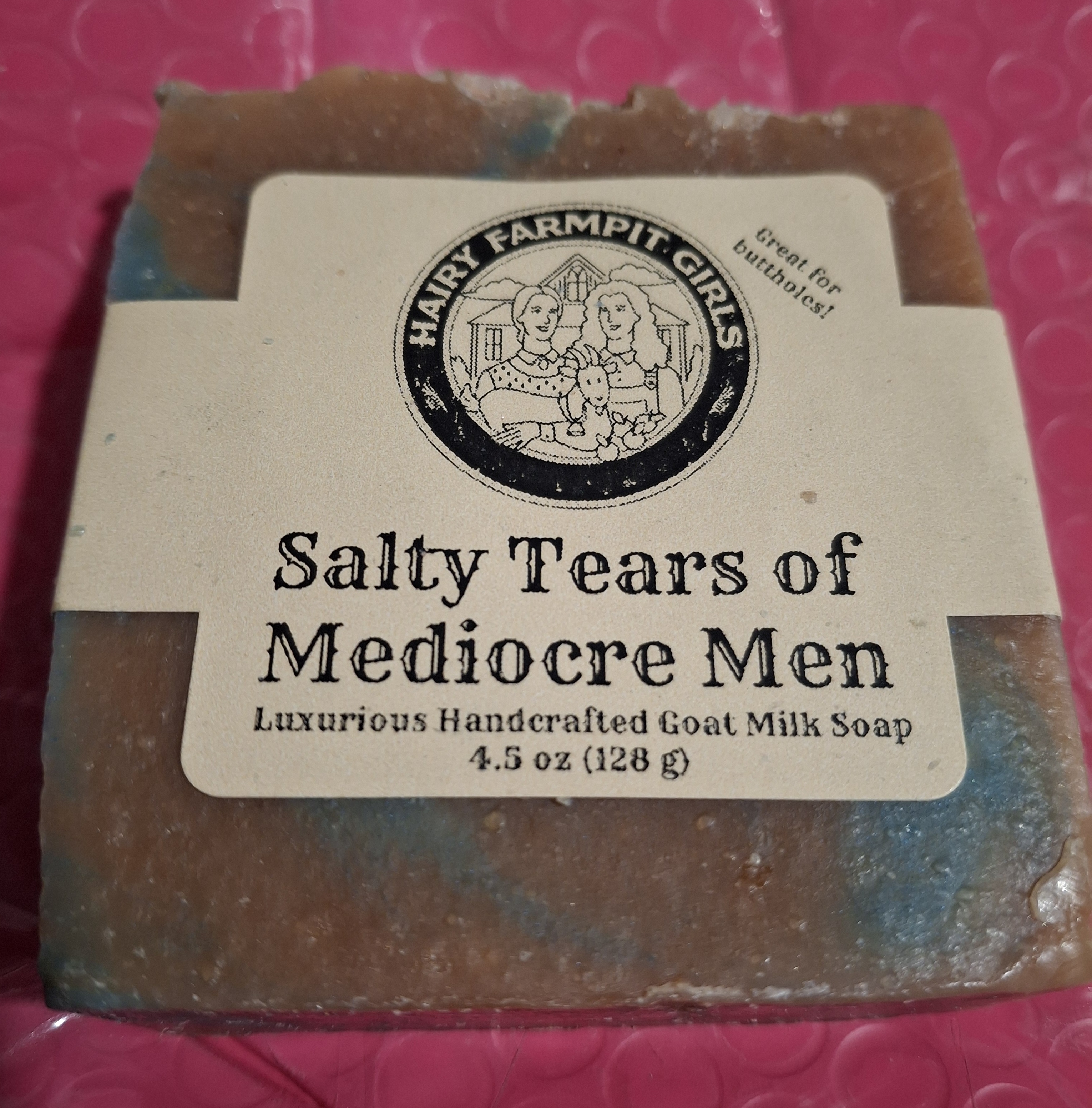 Men like this are why women like me buy things like Hairy Farmpit Girls’ soap, such as the one labeled “Salty Tears of Mediocre Men” (it smells delightful, by the way) because it amuses us. Plus, goat’s milk soap is good for the skin, soooo …