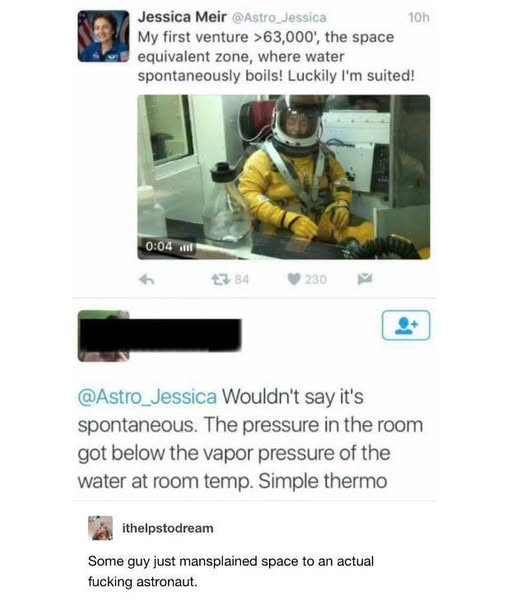 Consider the possibility that, say, a woman with a Ph.D. in astrophysics is more qualified to be an astronaut than Joe Schmo down the block who has all the dialogue from “Apollo 13” memorized, makes rockets from kits in his backyard, and once completely rebuilt a 1967 Mustang (an extreme example, I know, but you’d be amazed how many random guys try to mansplain physics to female astrophysicists/astronauts/physiologists, etc., online).