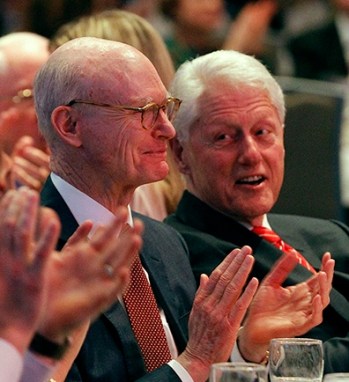 Arkansas Democrat-Gazette publisher Walter E. Hussman Jr. laughs with former President Bill Clinton during the 200th Anniversary celebration of the Arkansas Gazette.