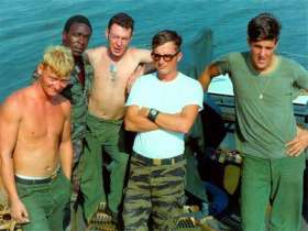 John Kerry (far right) with some of his crew aboard a “swift boat” on the Mekong River during the Vietnam War. Image from KRT.