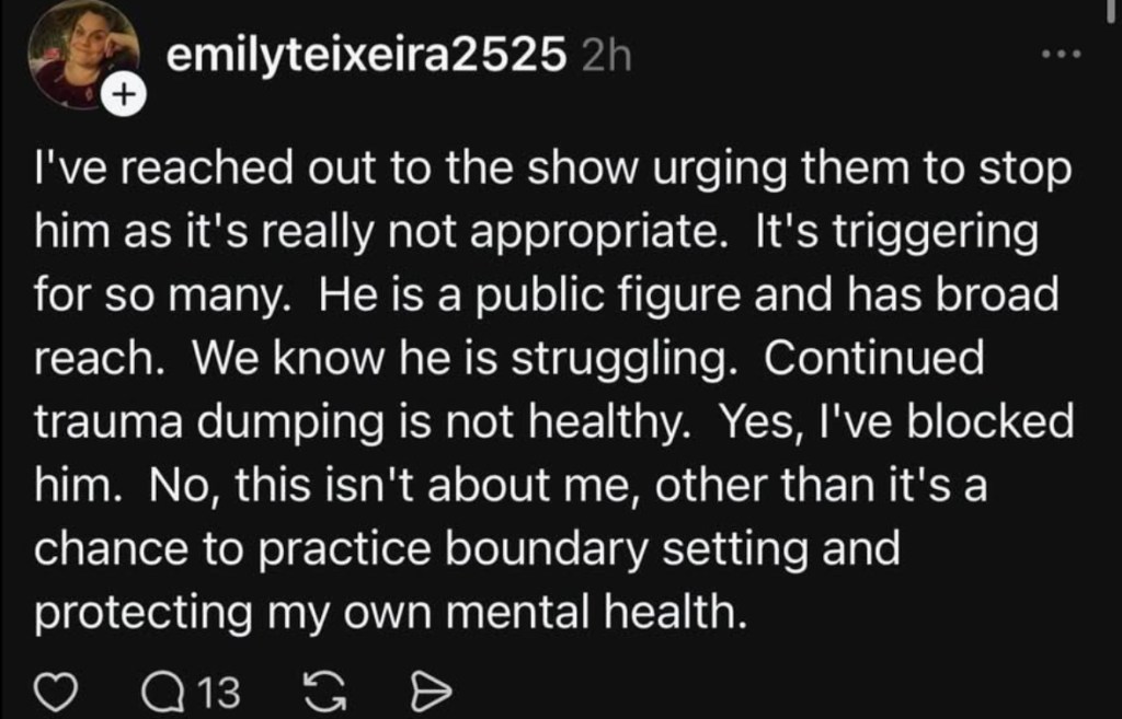 Threets added a trigger warning to his post about suicidal ideation, and hid the text (a nice little feature Threads has) so that you would have to actually click on it to read it, thus making it a lot less likely that someone would accidentally be triggered by what he wrote. And yet one person posted in response that she had reached out to “Reading Rainbow” to “stop him” because he’s a public figure with broad reach, and “continued trauma dumping is not healthy.”