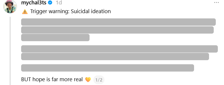 I’m not a great proponent of trigger warnings (I think that comes from being Gen X and feral), but I understand the need for them, and Mychal did the right thing here. Screenshot from Threads.