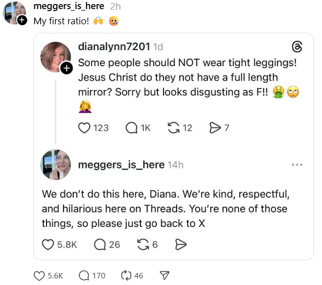 It didn’t take her long, though, to figure out that the Threads algorithm was not on her side, since she apparently fled. If only more bullies would take the hint. (I know, the bullies are going to claim they’re being bullied; nope, that’s called reaping the consequences of your actions. I know it’s not seen enough these days, but it happens, especially in spaces that care about rules and protecting people.)