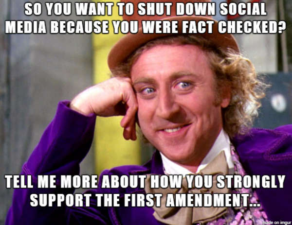 I hear reality is a bitch. Plus, it likes to hang out with things like enforcement of social media terms of service/community standards (Facebook bans misrepresentation on voting, for example, though enforcement has been spotty) and point out that if you don’t agree with the terms of service, you can always go somewhere else. Pssshhhh.
