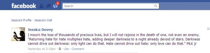 I will mourn the loss of thousands of precious lives, but I will not rejoice in the death of one, not even an enemy. “Returning hate for hate multiplies hate, adding deeper darkness to a night already devoid of stars. Darkness cannot drive out darkness; only light can do that. Hate cannot drive out hate, only love can do that.” MLK Jr.