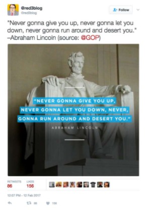 I love that this was one of the responses to the GOP tweeting a fake Lincoln quote on Lincoln’s birthday.