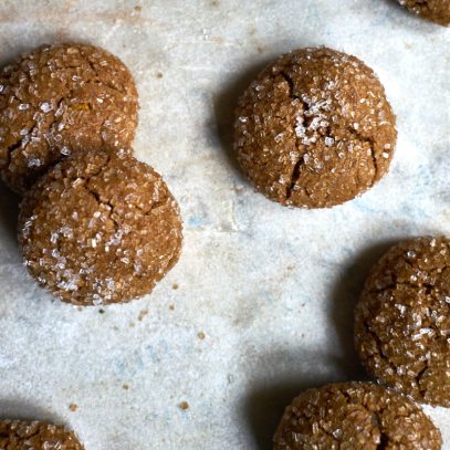 Before I go, I’ll share with you one recipe from my family’s files: Ginger Puffs. They’re based on the traditional ginger snap recipe, but we use oil instead of butter or shortening for the fat, which makes them softer and chewier, like those Archway molasses cookies. You can use whatever type of molasses you’d like, depending on how strong you want that flavor to be. (I typically go with a lighter molasses, as blackstrap can be a bit overpowering. Grandma’s is a good brand that’s fairly easy to find.) They’re bite-sized and coated with sugar, and were a favorite of my dad’s.