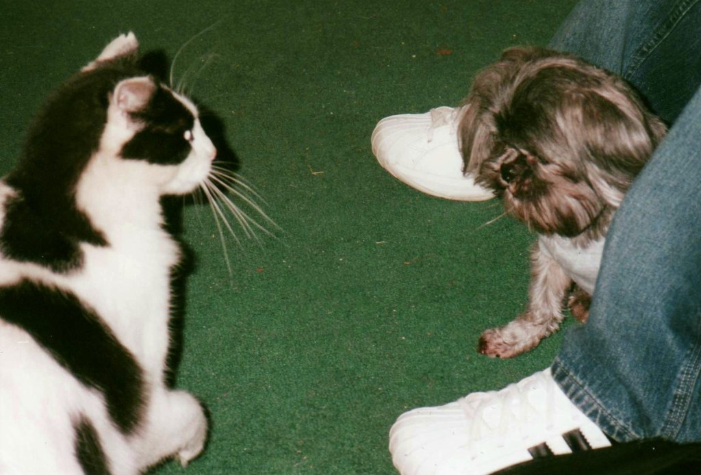 Despite the stare-down on that ugly green carpet and Luke’s raised paw, he and Gizmo were friends. Now both are gone.