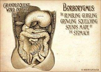That gurgling is called borborygmus, or intestinal rumbling caused by moving gas, according to Merriam-Webster. “If in looking at the word you thought it was just some crazy coinage invented by someone who thought the word matched the rumbling sound it represented, you’d be right, in a way,” the dictionary says. “We picked it up from New Latin, but it traces to the Greek verb borboryzein, which means ‘to rumble.’ It is believed that the Greek verb was coined to imitate the digestive noises made by a stomach. ‘Borborygmus’ has been part of English for at least 250 years; its earliest known use dates from around 1724.”