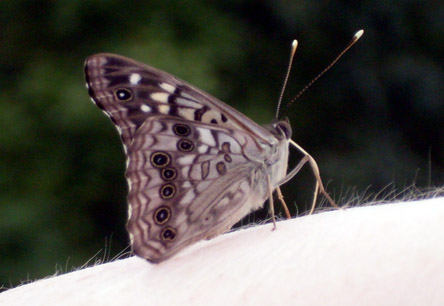 A Hackberry Emperor on my right arm; a tough picture to take (and get in focus) when you’re right-handed. But go away, bud, I’m no salt lick!