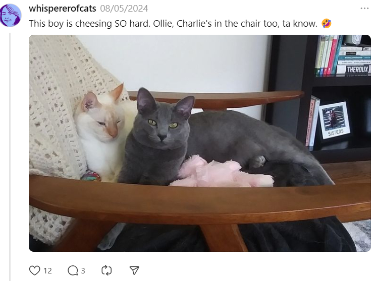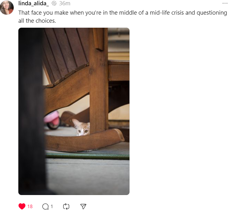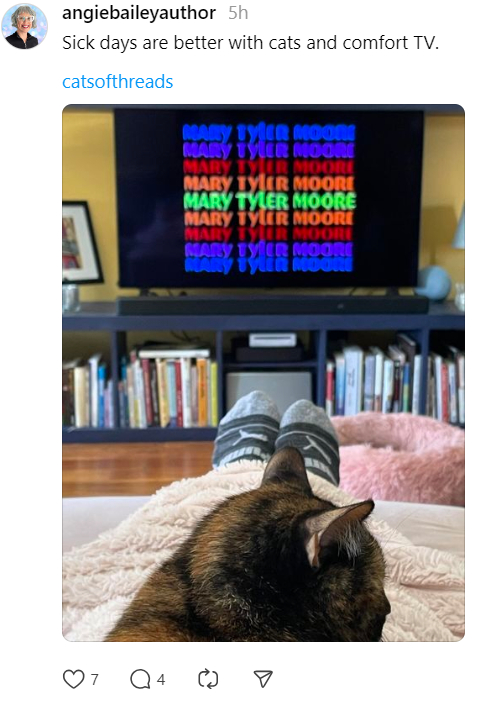 I have made so many friends on Threads who are just living their lives, and happy to share what gives them joy as well as their struggles, knowing that they’re more likely to find support there than rancor. There are just so many of my people there: word nerds, writers, photographers, cat people, social anxiety sufferers, good people who support other good people and who fight for those who are hurt by this world. It’s hard some nights to shut down my feed because of the love and support I find there. Sure, there are also bots and trolls, but they don’t get much air because toxicity is unwelcome. Kinda like it used to be in the real world.
