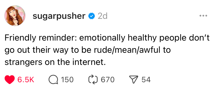 Threads and Facebook are where the majority of my social-media minutes go, and though the two are owned by the same company, I lose myself to hopescrolling more often on Threads, partly as a function of how we early adopters were able to teach the algorithm that we wanted to see more joy and less doom. There will always be those who seek out things to be offended by (see the last two weeks’ columns for proof of that), and you can find angry-making content, but we don’t have to be that way.