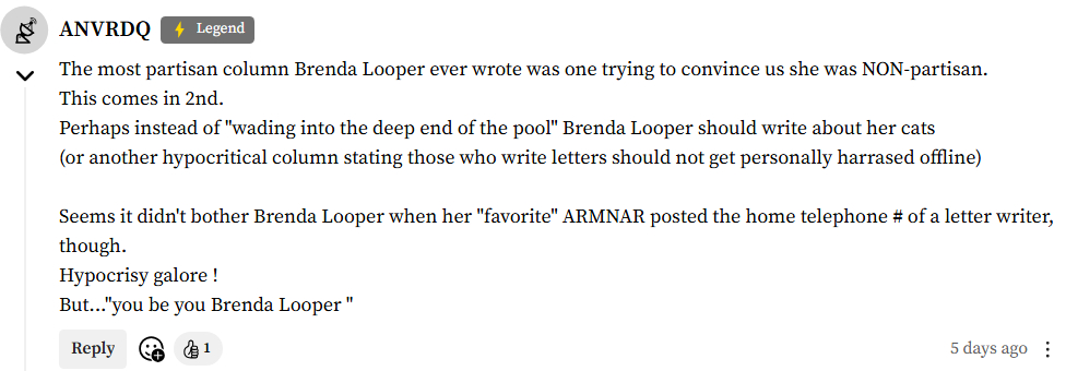 For instance, one anonymous troll is still convinced that I once wrote an entire column saying I was nonpartisan (though he’s never produced said column despite being asked numerous times). Having the entirety of what I’ve written for the paper and my blog (and my limited social media) at my fingertips, I can state confidently that I have never said I’m nonpartisan. It would defy the rules of logic for me to say that, as I have opinions of my own. (He also believes I moderate the comments on the newspaper’s site and am online pretty much 24/7 so had to have seen a post from another commenter supposedly doxxing him and his family. I don’t, I’m not, and I didn’t, plus no one but the troll’s compatriots have said they saw it, and no one thought to make a screenshot of it, apparently. 🙄)