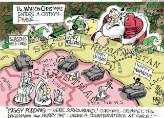 Usually at this time of year, it’s all about the supposed “War on Christmas” because some folks wish people they don’t know (and therefore don’t know what holidays they celebrate among the plethora at this time of year) “Happy holidays.” How dare! There’s also assorted mishegoss over religious displays on government property (hey, if you let Christians put displays up, that means you have to let others do the same, so stop complaining when the local synagogue, mosque, and/or secularists insist on displays as well; private property is a different thing altogether from public property paid for by taxpayers, so have at it there, within the rules of your city/ homeowners association/whatever).