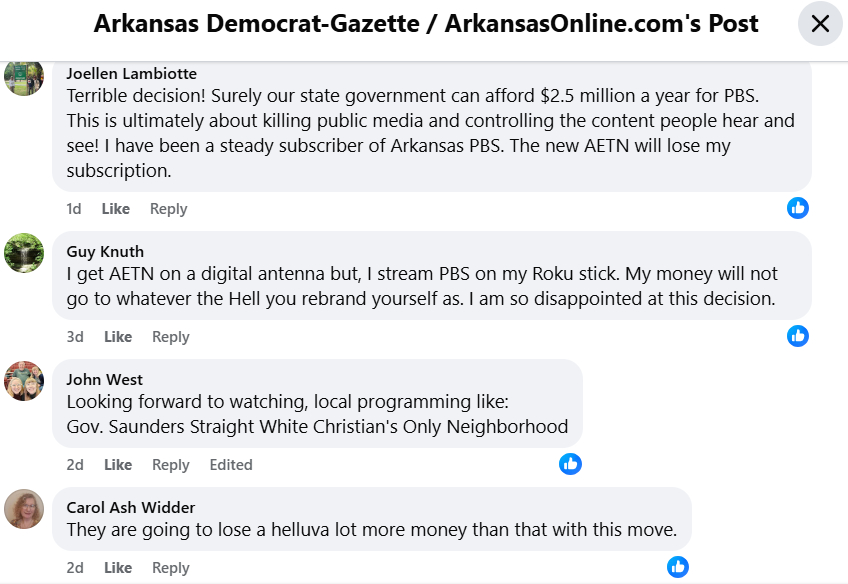 Except that there appear to be quite a few Arkansans, judging from social media posts, who are now pulling their donations from Arkansas in favor of surrounding states that retain their PBS affiliation (not much help for those of us in central Arkansas, though; we can contribute elsewhere, but we’re not near enough to our borders to easily get a signal from other states over the air).
