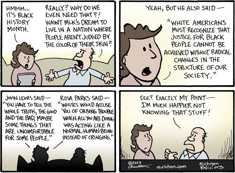 A lot of white cisgender people don’t want to believe that they or anyone else like them has ever mistreated someone who’s different from them. Editorial cartoon by John Auchter, Michigan Radio.