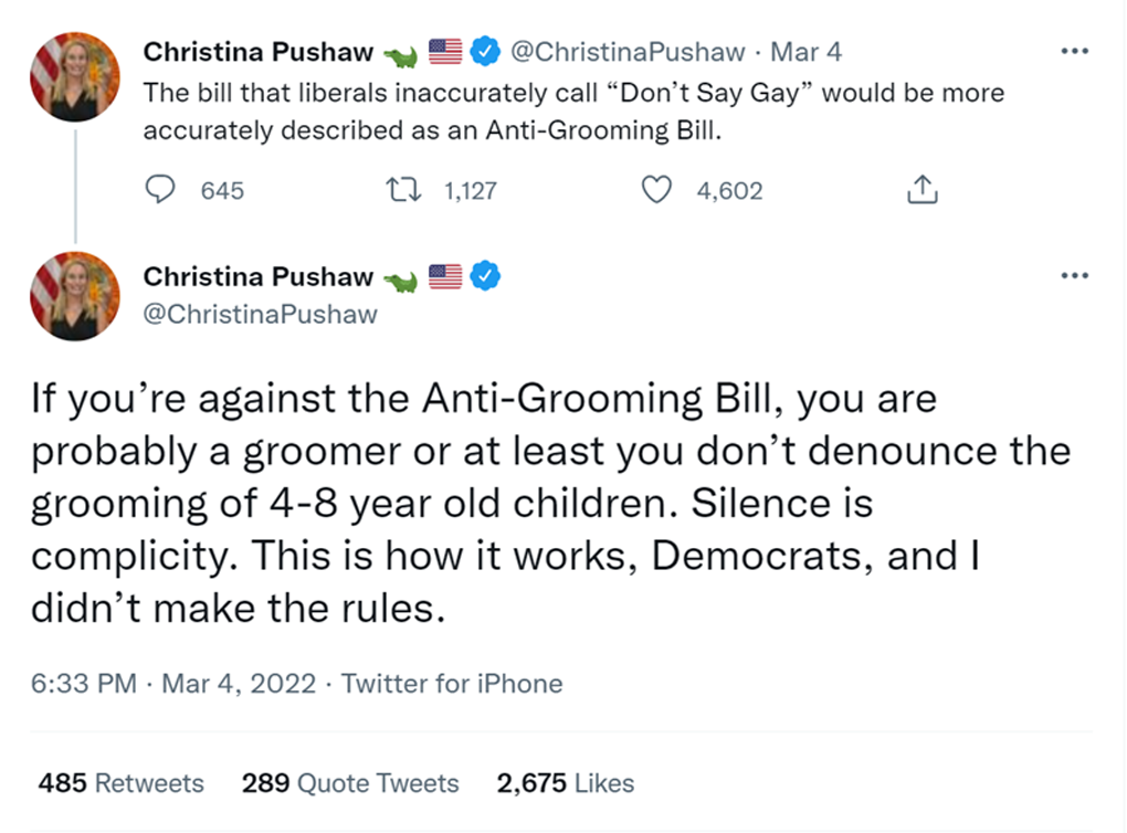 This is the sort of rhetoric we get now, this one from the press secretary for Florida Gov. Ron DeSantis, which co-opts a legitimate term relating to sexual abuse to apply it to LGBTQ. Screenshot found on Anti-Defamation League.