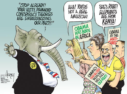 About a year ago, Public Policy Polling surveyed 790 registered voters on various conspiracy theories, and found that Republicans were more likely than other partisans to believe theories such as Barack Obama plotting to take away guns, Muslims implementing Sharia law in the U.S., or the government allowing aliens (the extraterrestrial sort, in this instance) to take over.