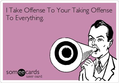Maybe the most ridiculous taking of offense, to me, anyway, is being offended that someone else is offended, especially if that person’s offense is merited. Times change, so the things that were widely accepted before—racist or sexist remarks, widespread ethnic and gender discrimination, making fun of medical conditions, etc.— aren’t OK now for the majority of people, so being offended that you can’t do that without facing consequences is just childish.