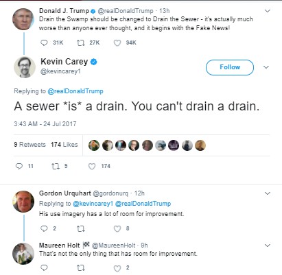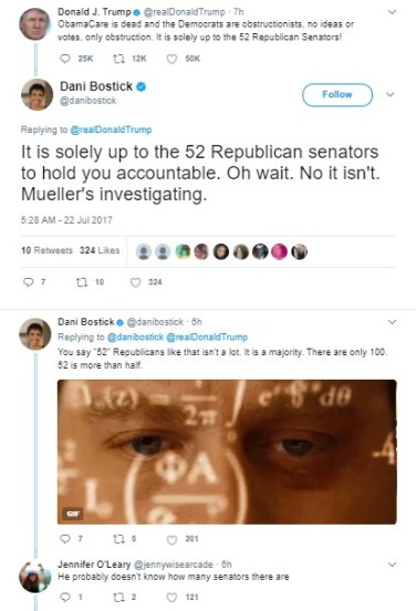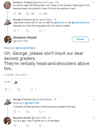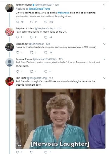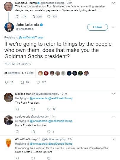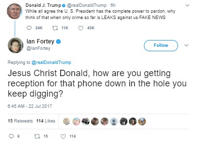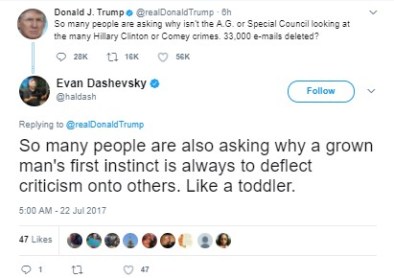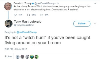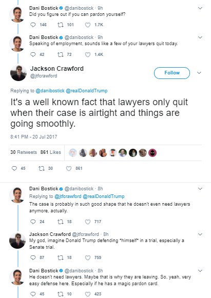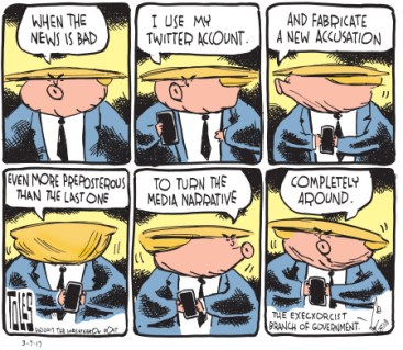 Since my column this week is a Q-and-A on letters, let’s start this week with our Twitter burns. Someone seems to be getting even more unhinged, if that’s possible, what with Jared Kushner being questioned and throwing his brother-in-law under the bus, Spicey and lawyers quitting, and all manner of fun stuff going on (like the possibility that Robert Mueller is looking at tRump’s tax records). Sooooo much to laugh at …