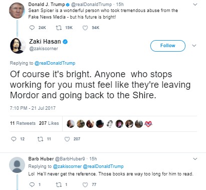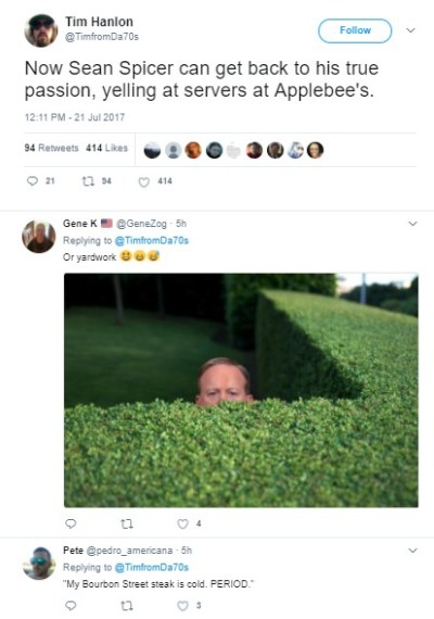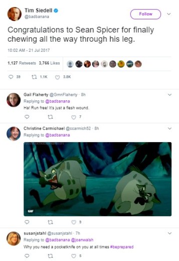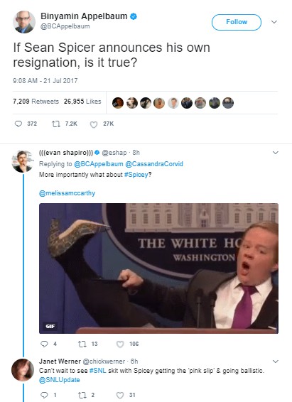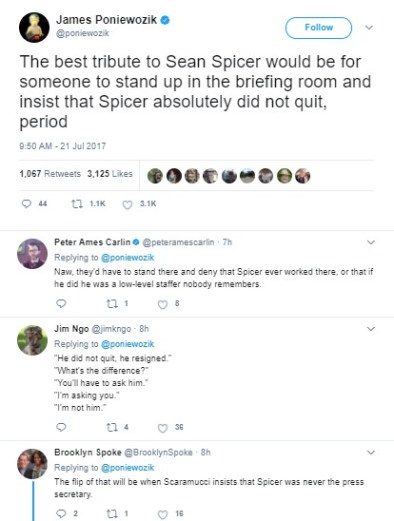 I’ve been amused by the hard-right Trumpers who seem to think that the mainstream media loves Sean Spicer now that he’s quit the White House. Looks to me like most are feeling sorry for the guy … which seemed nearly impossible till last week. I’m not seeing the love … it’s pretty hard to love someone who treats you like crap.