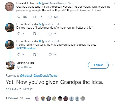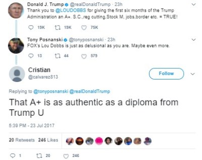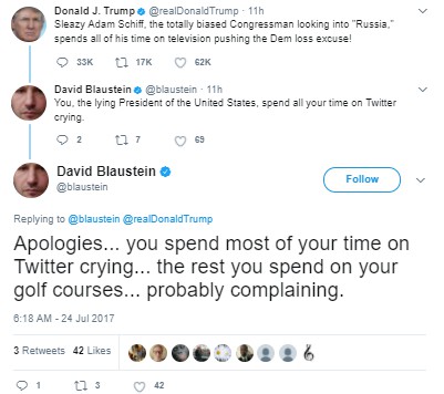 A. I don’t really hate Donald Trump. I strongly detest that he manages to keep people believing things that are so laughably easy to prove untrue (largest inaugural audience ever????), just as I would anyone who abused such sway. But that has nothing to do with what letters are printed, and the overwhelming majority of printable political letters I get are anti-Trump. And who can really say that isn’t to be expected, especially considering the massive tweetstorms he’s been perpetrating lately, which just fan the flames rather than serve as the distraction he seems to want?