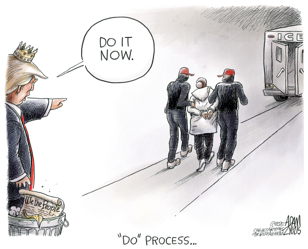 Supporters of the current regime tend to forget that by being in this country, even illegal aliens are supposed to be allowed due process, as it ensures that the person being deported actually is someone who merits deportation. Editorial cartoon by Adam Zyglis, Buffalo News.