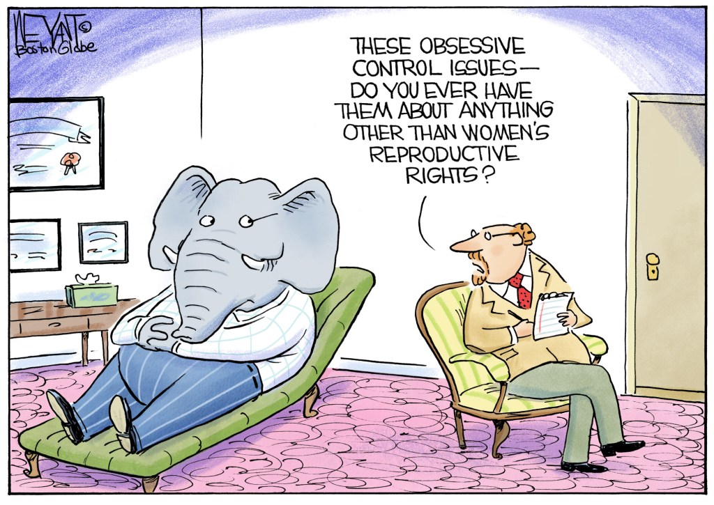 Yes, transgender women (because they’re women), indoctrination and “grooming” in schools and libraries, history of discrimination against women, people of color, LGBTQ+ people being taught/ acknowledged, etc. Editorial cartoon by Christopher Weyant, Boston Globe.